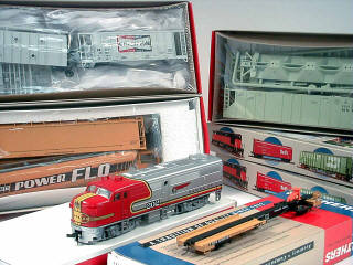 comprend : une locomotive diesel ALCO FA 1, un wagon porte-remorque routier & 5 wagons trémie en kit jamais déballés