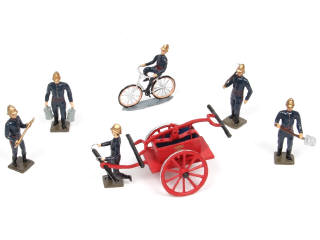 C.B.G. (FRANCE) Ensemble de 6 pompiers & d'une pompe mobile rouge & bleu