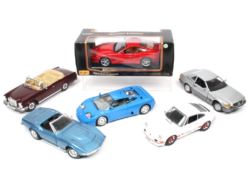 échelle 1/18ème - miniatures reproduisant les modèles : PORSCHE, MERCEDES, CORVETTE & BUGATTI - on y retrouve les marques : BBURAGO, MAISTO, JOUEF EVOLUTION & REVELL