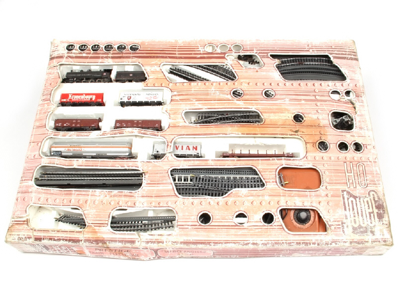 non testé - contient : locomotive à vapeur type 140 C 231 avec tender - wagons fourgon, plateau, citerne, rails droits, courbes, accessoires & transformateur - possibilités de manques & parties cassées - boite sans blister - ensemble encrassé