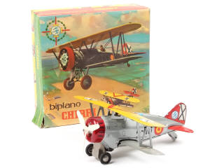 RICO (ESPAGNE) 4 Avion biplan en tôle lithographiée gris métal, jaune & rouge
