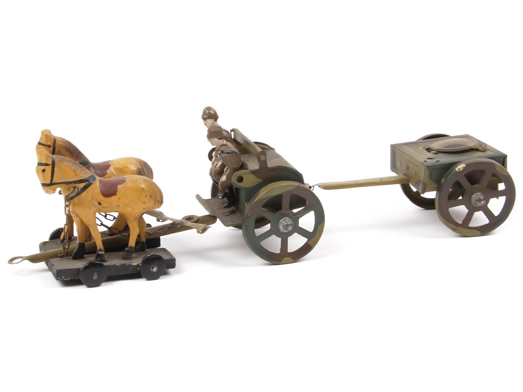 longueur de l'ensemble : 24 cm - avec 2 soldats & 2 chevaux - avec manques - quelques petits éléments plus ou moins déformés