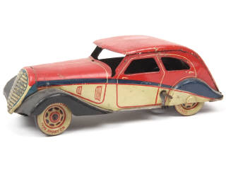 longueur 22 cm - avec moteur à ressort (manque séparation de pare-brise & tête de clef, fonctionne poussivement) & direction - carrosserie encrassée avec parties plus ou moins déformées, quelques agrafes déficientes & frottements plus ou moins importants