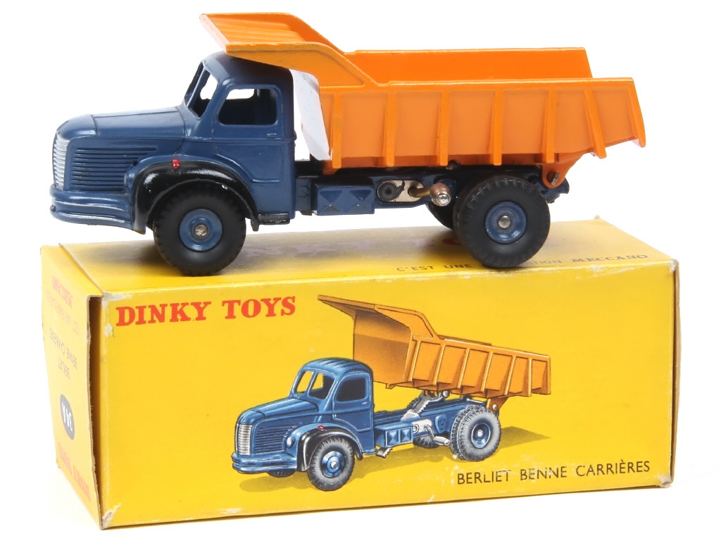 DINKY TOYS (FRANCE) 580 BERLIET Benne carrière MARREL (version avec jantes concaves) bleu foncé & orange