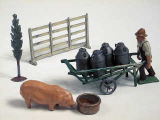 dont 1 fermier avec sa charette (B), 4 pots à lait (A), 1 porc (C), 1 barrière (B), 1 arbre (B) & 1 panier (b)