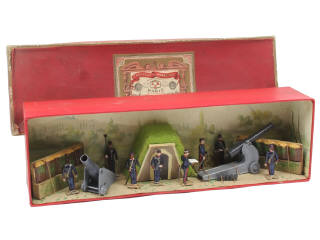 production du début du XXème siècle - dimensions : 40,5x8,5x12 cm - contient : 8 artilleurs (dont un officier & un soldat avec tête manquante), un canon de 155 mm, obusier de 220 mm, un abri, 5 obus & 2 fortifications - ensemble fixé par ficelles de maintien d'origine (un canon désolidarisé) - coffret encrassé avec couvercle légèrement gondolé (avec accrocs) - SUPERBE !