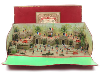 production en demi ronde-bosse du début du XXème siècle (hauteur des figurines 4 cm) - dimensions : 49x9,5x13 cm - contient : 50 soldats français (dont 4 officiers sur leur monture), éléments de fortification, 14 végétaux & 3 canons - peinture légèrement altérée sur quelques exemplaires - ensemble fixé par ficelles de maintien d'origine (2 coupées) - coffret légèrement taché & plus ou moins déformé - SUPERBE !