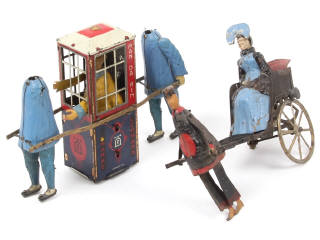 dimension : 18x14,5 cm - moteur à ressort (fonctionne, clef légèrement déformée) - parties dorées en grande partie ternies - les porteurs sont incomplets (manque 2 têtes & 3 bras)
