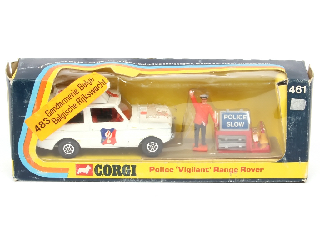 avec personnage & accessoires sous blister jamais ouvert - version peu courante destinée au marché belge avec boîte de la référence 461 comportant une étiquette 'GENDARMERIE BELGE' - quelques frottements sur les arêtes de caisse - on y joint 8 cônes & 3 panneaux supplémentaires - blister en partie déchiré
