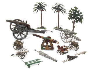 états de 'C' à 'F' - réalisations en métal - comprend : 7 canons, un train d'artillerie hippomobile, un diable & 3 arbres - on y retrouve notamment les marques : S.R, C.B.G, MÄRKLIN, C.R & HORNBY - avec manques, parties cassées & plus ou moins déformées