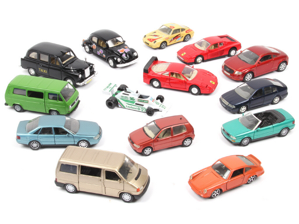 comprend notamment les modèles : PORSCHE, FERRARI, VW, SKODA & AUDI - on y retrouve notamment les marques : WELLY, POLISTIL, SCHABAK, YAXON & CONRAD - quelques exemplaires en état 'B' - avec petits manques & parties cassées