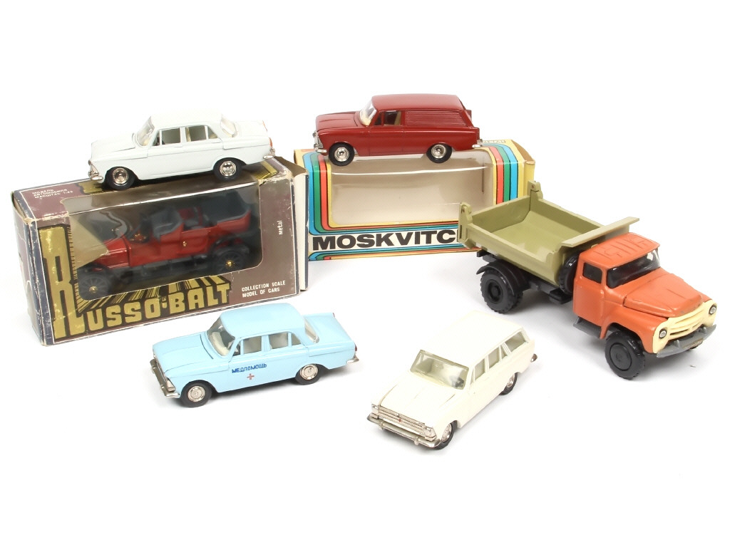 états de 'A' à 'C' - miniatures reproduisant notamment les modèles : RUSSOBALT & MOSKVITCH - manque une plaque minéralogique sur un camion - 2 modèles en boite (état 'c')