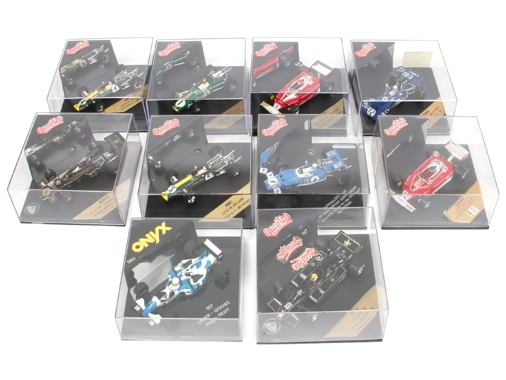 comprend les modèles : LOTUS (3 exemplaires), FERRARI (2 exemplaires), TYRRELL, BRABHAM & MATRA - on y joint une LIGIER de la série ONYX