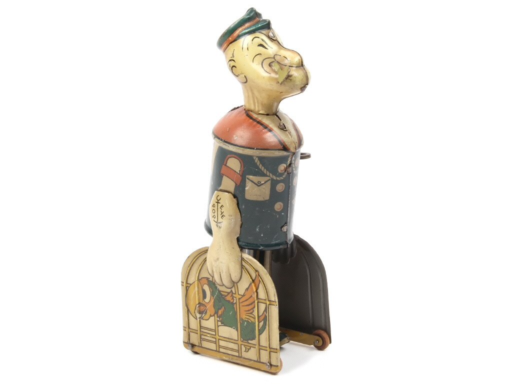 MARX TOYS (USA) POPEYE avec perroquets en cage en tôle lithographiée bleu, rouge & blanc