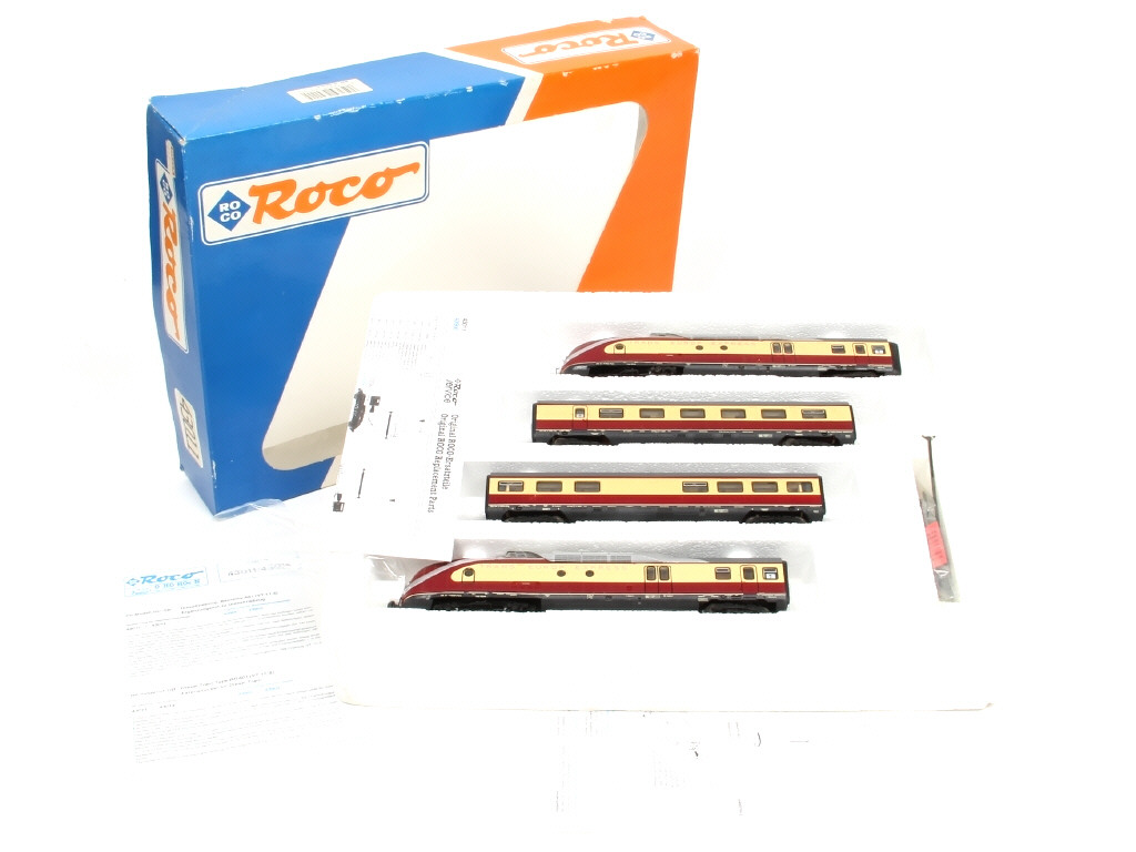 contient : motrice de tête, 2 voitures de voyageurs & motrice de queue (non motorisée) - avec sachet d'accessoires & notices - motrices plus ou moins poussièreuses