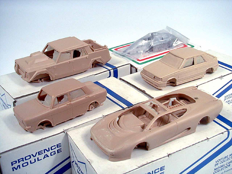 miniatures reproduisant les marques : JAGUAR, LAMBORGHINI, RENAULT, LIGIER & SIMCA - on y retrouve les marques PROVENCE MOULAGE & MERI KITS - une main courante cassée - sans garantie sur la présence de toutes les pièces