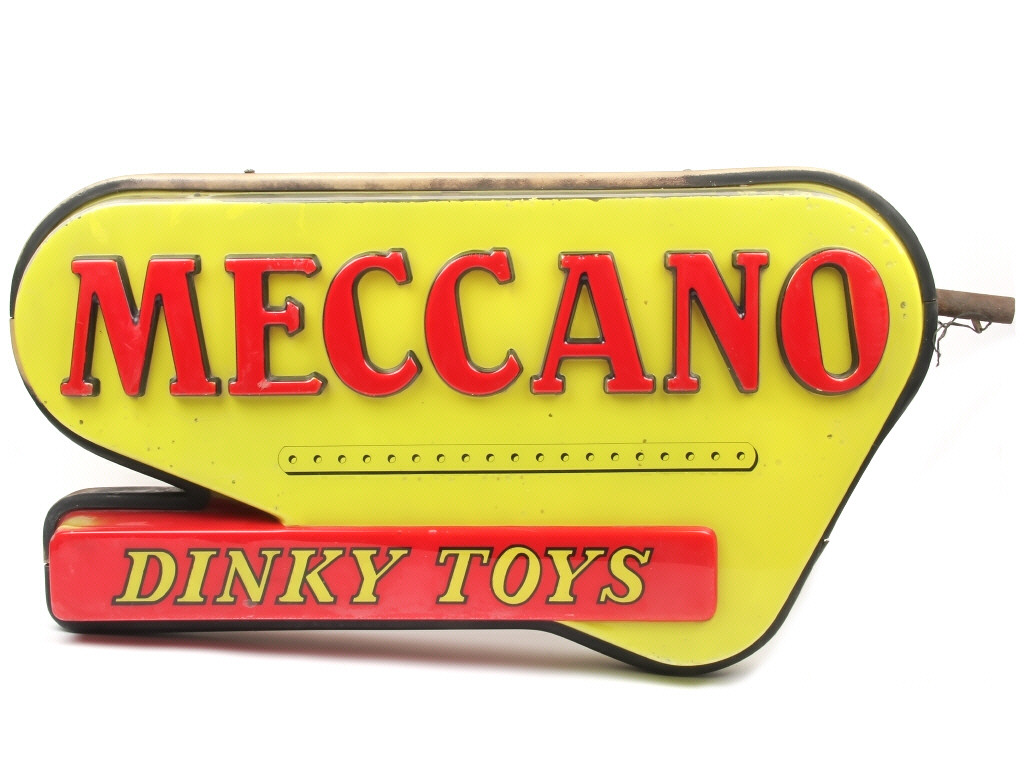 DIVERS Enseigne lumineuse de magasin 'MECCANO-HORNBY-DINKY TOYS' à 2 faces en plastique jaune & rouge