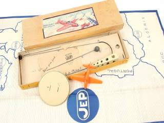 contient : avion en plastique, socle, flexible de guidage, pylône (légère déformation), une carte géographique JEP, cale de fond de boîte, fiche de garantie & notice - couvercle légèrement tâché & décoloré - semble complet
