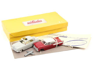 contient : une carrosserie avec partie vitrée amovible (un petit frottement sur le toit) de SIMCA CHAMBORD, une autre de PEUGEOT 403, un châssis avant avec volant, arrière, un aménagement intérieur, une clef de démontage, carton de présentation & ficelles de maintien d'origine (coupées) - un exemplaire monté