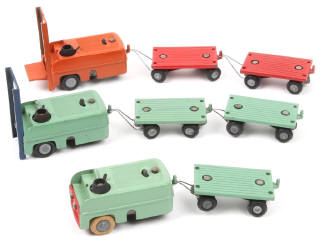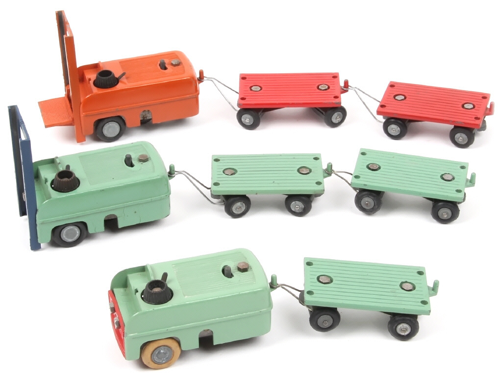 états de 'A' à 'C' - moteurs à clef (fonctionnent) - comprend : 2 chariots à fourches (dont un avec traces de métal fatigue) & un chariot de gare - quelques éléments manquants - pneus séchés & plus ou moins affaissés - quelques parties ternies avec petites traces d'oxydation par endroits