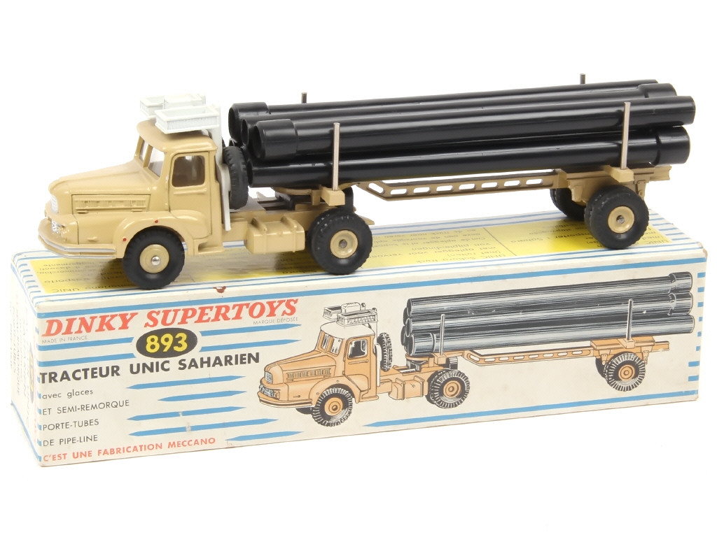 DINKY TOYS (FRANCE) 893 UNIC Saharien transport de pipe-lines (version avec jantes convexes & remorque ajourée) sable & blanc