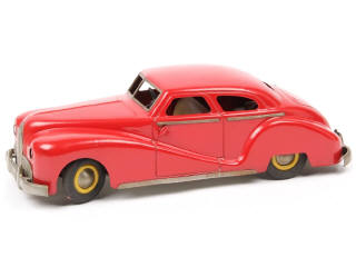longueur 34 cm - avec moteur à clef (fonctionne), porte ouvrante & phares électriques (non testés) - quelques défauts de peinture d'origine sur l'aile arrière droite - pneus craquelés - très légères traces d'oxydation par endroits - papier d'instructions du compartiment à pile taché