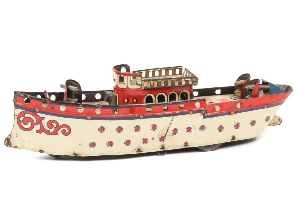 DIVERS Navire de guerre en tôle lithographiée crème, rouge & bleu