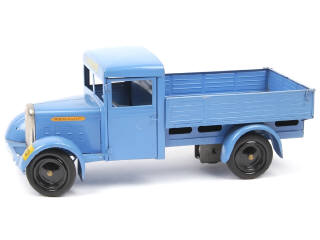 longueur : 43 cm - avec moteur à clef (fonctionne) & direction (sans accessoire) - version économique sans phare avec inscriptions au pochoir 'CAMIONNAGE' sur le fronton de cabine, 'TD' sur l'aile avant gauche & '4748 - RN6' à l'arrière & sur le pare-chocs avant - très légères déformations, petites rayures & frottements sur la carrosserie par endroits - pneus séchés