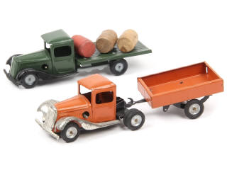 longueur 18,5 cm - moteur à clef (fonctionne) - parties chromées légèrement ternies - on y joint un camion-plateau en état 'A' (moteur à clef fonctionne) non d'origine (copie) & 3 tonneaux