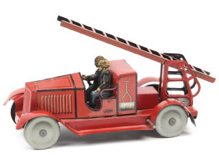 longueur 20,5 cm - avec moteur à ressort (à revoir, tige incomplète) & 2 pompiers - quelques agrafes manquantes & légères traces d'oxydation par endroits - manques de peinture sur l'échelle & les roues