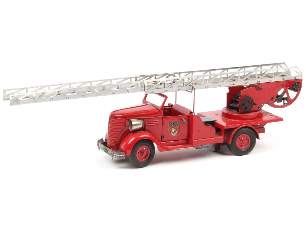 longueur 39 cm - avec moteur à clef (à revoir) & direction - manque volant & une partie de la colonne de direction - échelle plus ou moins déformée (bloquée) - sans pompier ni système électrique