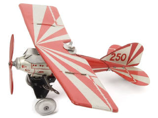 envergure 28 cm - moteur à ressort (à revoir) - axe de roues légèrement déformé - support d'hélice fêlé - très légères déformations par endroits