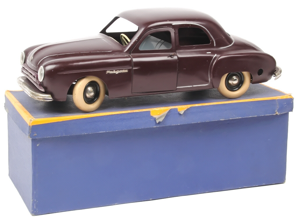 longueur 31,5 cm - version avec calandre à 3 barres, moteur à clef (fonctionne), direction, porte conducteur ouvrante & phares électriques (non testés) - quelques éclats & frottements plus ou moins importants sur la carrosserie par endroits (notamment sur le capot-moteur, le toit & la portière avant droite - quelques petites traces d'oxydation sur le cache-moteur, les pare-chocs & les jantes
