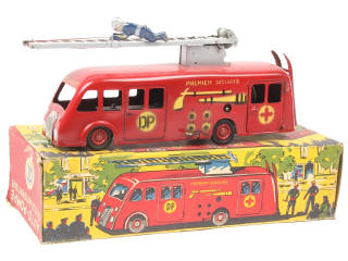 longueur 27 cm - version avec échelle simple & pompier - avec moteur à clef (fonctionne), mécanisme de montée du personnage sur l'échelle (à revoir) & sirène 2 tons - pneus plus ou moins affaissés - une fixation de main de pompier manquante