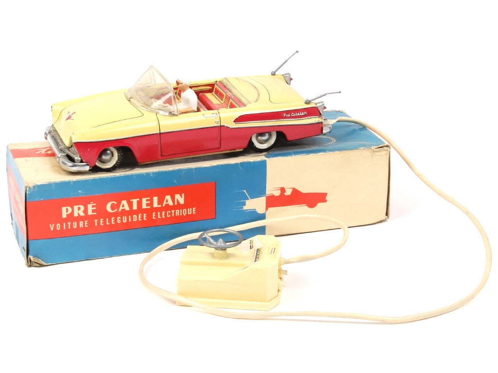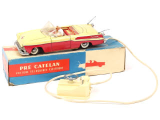 longueur : 26,5 cm - avec moteur à pile (à revoir) & direction - jantes plus ou moins fondues - parties chromées légèrement ternies - importantes annotations sous le fond de boîte