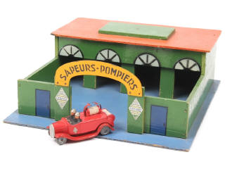 dimensions : 28 x 30 x 9,5 cm - avec sirène actionnée par une manivelle à l'arrière du bâtiment - manque élément de toit & une pointe - petits manques sur une publicité