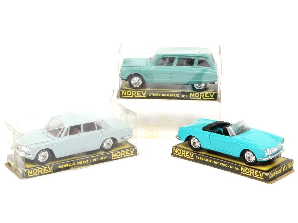 comprend : CITROEN AMI 6 break (vitrage légèrement opacifié), SIMCA 1501 & FIAT 1500 cabriolet (pare-brise avec petits frottements - carrosserie légèrement déformée) - adhésif sur les socles de boite