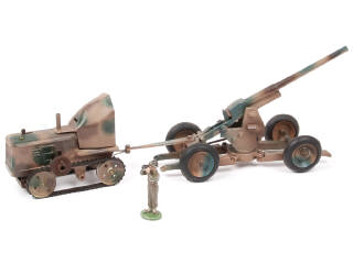 moteur à clef (à revoir) - comprend : un tracteur à chenilles avec habitacle blindé (habitacle non d'origine, réalisation sur une base agricole), un canon de 105 sur châssis mobile & un observateur aux jumelles (état 'C') - quelques petites fixations non d'origine - BELLE REALISATION !