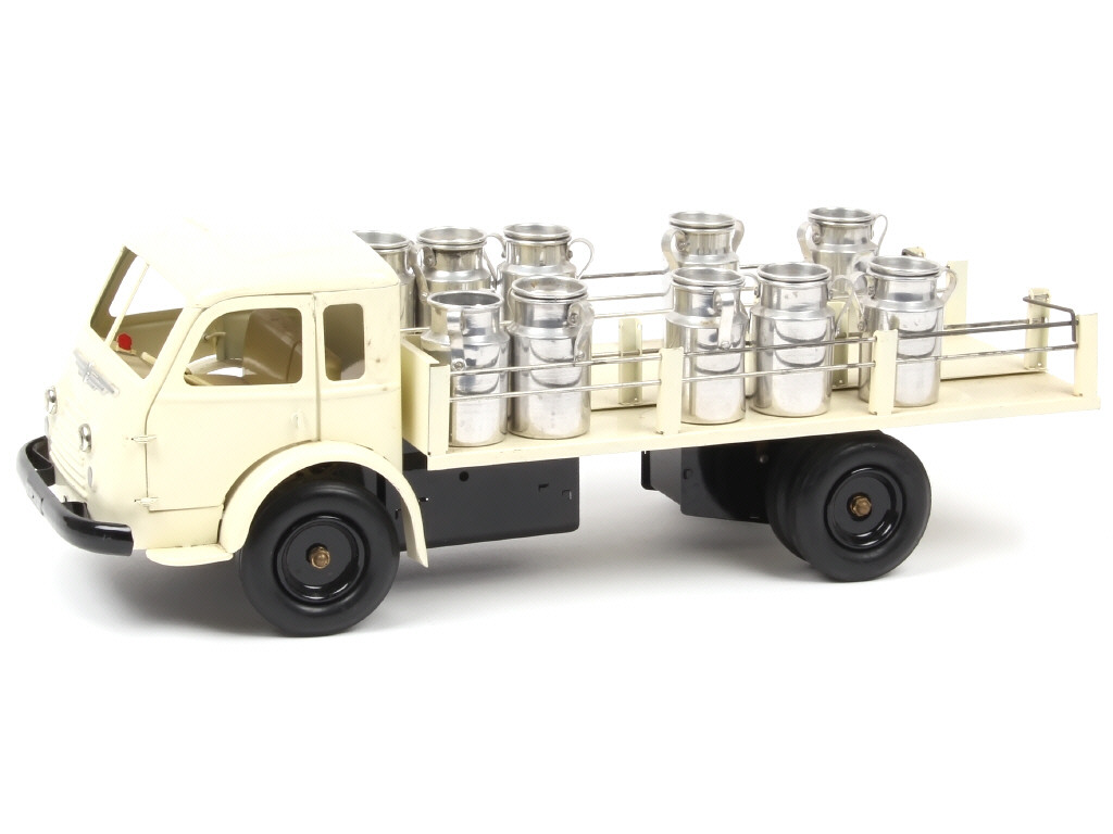 longueur 42 cm - version luxe de 1955 avec 10 pots à lait (quelques petits enfoncements par endroits avec un couvercle manquant) - avec moteur, phares électriques (à revoir), direction & portières ouvrantes - carrosserie encrassée - rambardes plus ou moins ternies