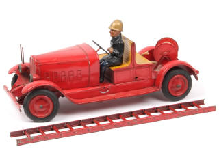modèle proche de l'état 'C' - longueur 41 cm - avec moteur à clef (fonctionne), direction par le volant, phares électriques (non testés) & échelle amovible - pompier non d'origine - quelques petites déformations sur la carrosserie par endroits (importante sur le haut des dossiers de banquettes) - manque lance