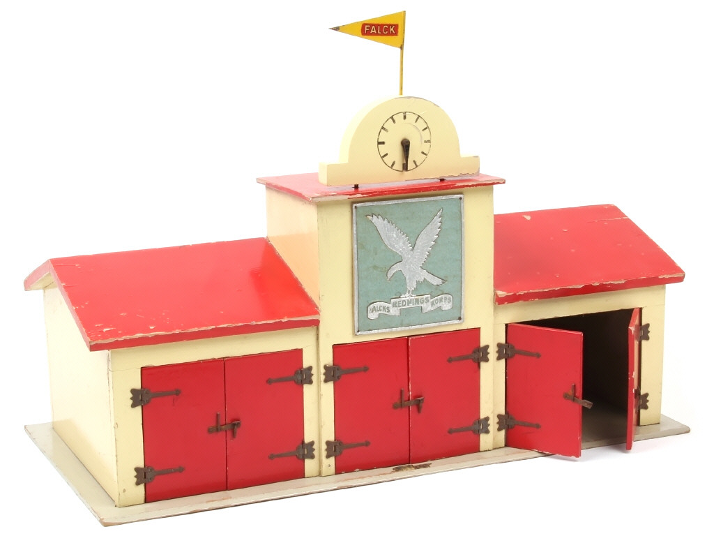 dimensions : 48 x 25 x 34 cm - avec fronton & drapeau amovibles 'FALCK' (traces d'humidité avec manques de peinture) - frottements avec manques de peinture plus ou moins importants & petites fêlures par endroits (principalement sur les toits & le socle) - charnières & fermetures oxydées - petites craquelures sur la peinture