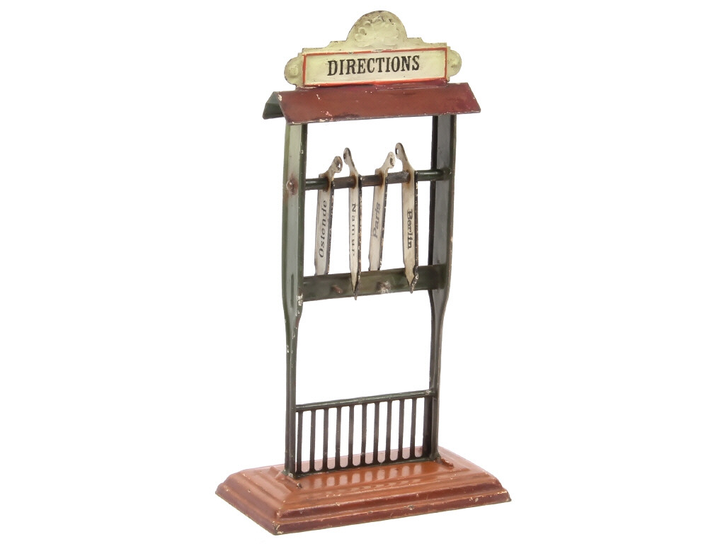 hauteur : 22 cm - avec 4 panonceaux mobiles (manque tiges métalliques) de destinations (BERLIN, PARIS, NAMUR & OSTENDE - éclats plus ou moins importants par endroits avec petites craquelures de peinture & légères déformations (quelques retouches)