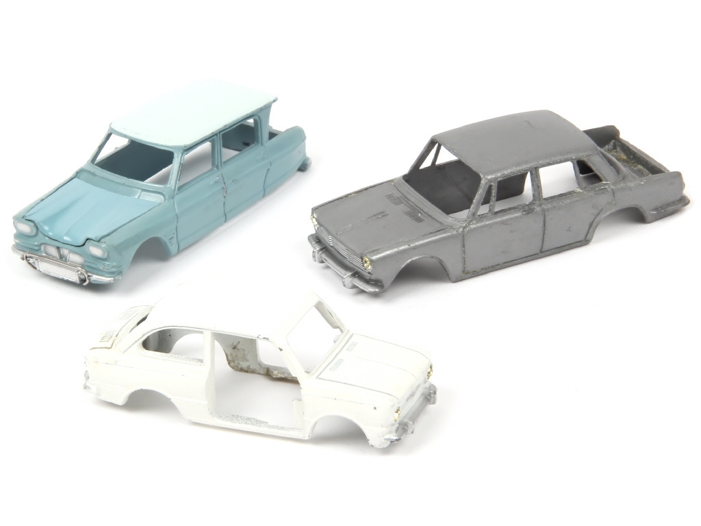 comprend les modèles : CITROËN AMI 6 (avec capot-moteur), SIMCA 1500 (traces d'humidité) & FIAT 850 - les carottes de fixation n'ont jamais été rivetées - ces exemplaires proviennent d'un stock de pièces en tous genres de l'usine MECCANO qui étaient destinées au rebut