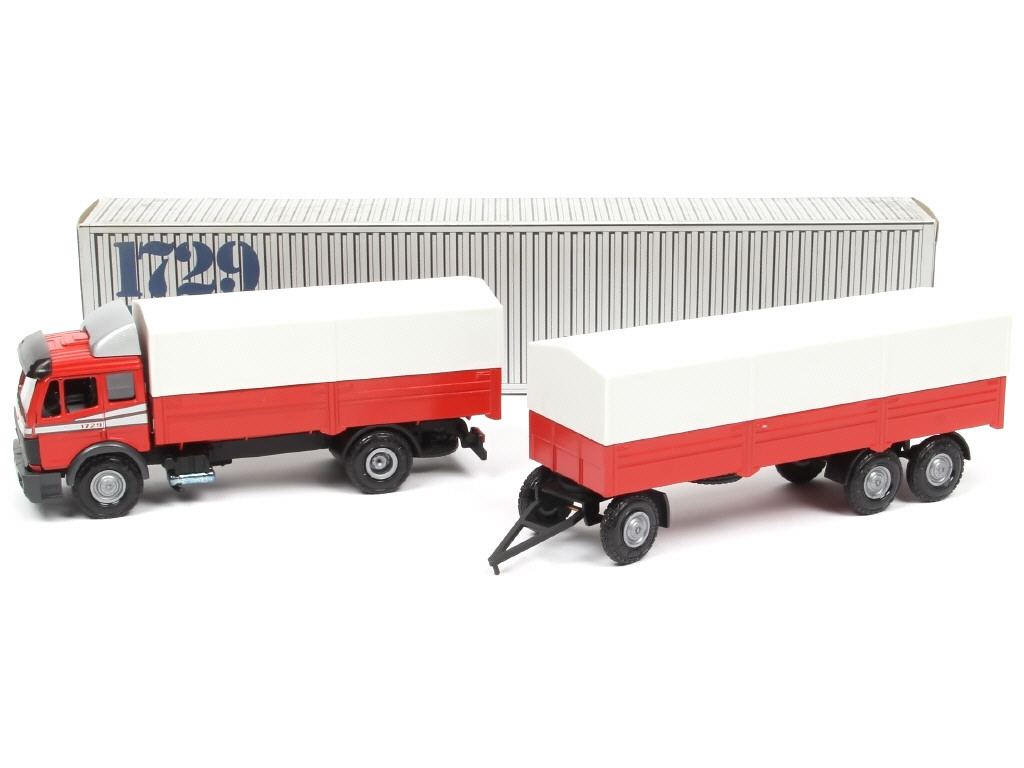 NZG (ALLEMAGNE) 314 MERCEDES 1729 Plateau à ridelles bâché avec remorque bâchée rouge & gris clair