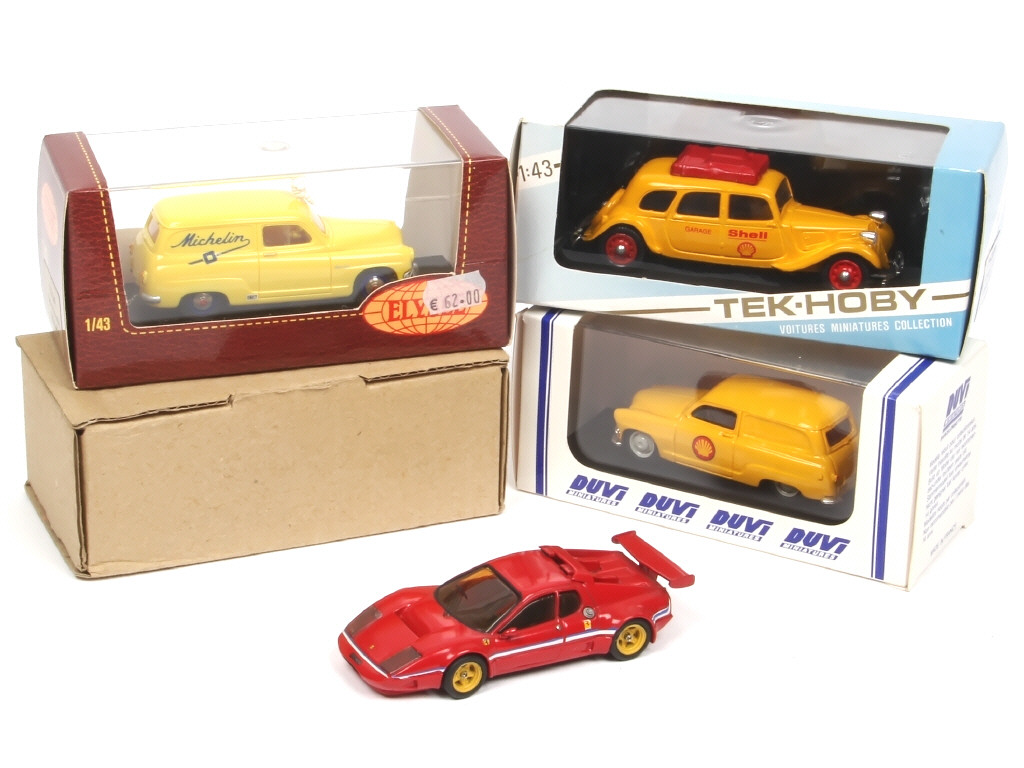 comprend : FERRARI BB 512 UDERZO, SIMCA ARONDE 'MICHELIN', MESSAGERE 'SHELL' & CITROEN 11 CV 'GARAGE SHELL' - on y retrouve les marques : M.O.G MODELES, ELYSEE, TEK-HOBY & DUVI