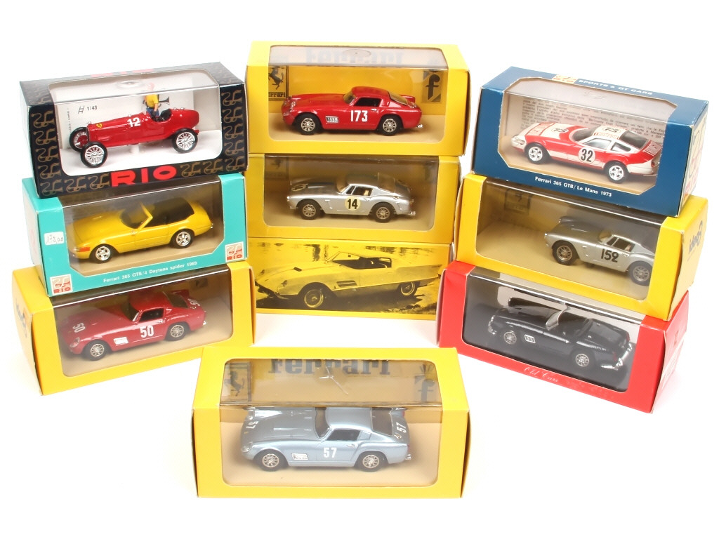 un exemplaire Le Mans - comprend les modèles : 250 GT, 410 S.A, 365 GTB & GTS - on y joint une ALFA ROMEO tipo - on y retrouve les marques : IDEA 3, RIO & OLD CARS - quelques suremballages avec accrocs & couvercles de boites fêlés