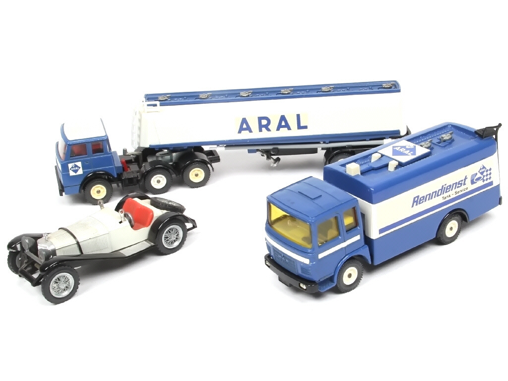 comprend : MAN citerne ARAL, HANOMAG semi-remorque citerne ARAL & MERCEDES SSK 1928 (manque pare-brise) - carrosseries légèrement encrassées - on y retrouve les marques : GAMA & SIKU