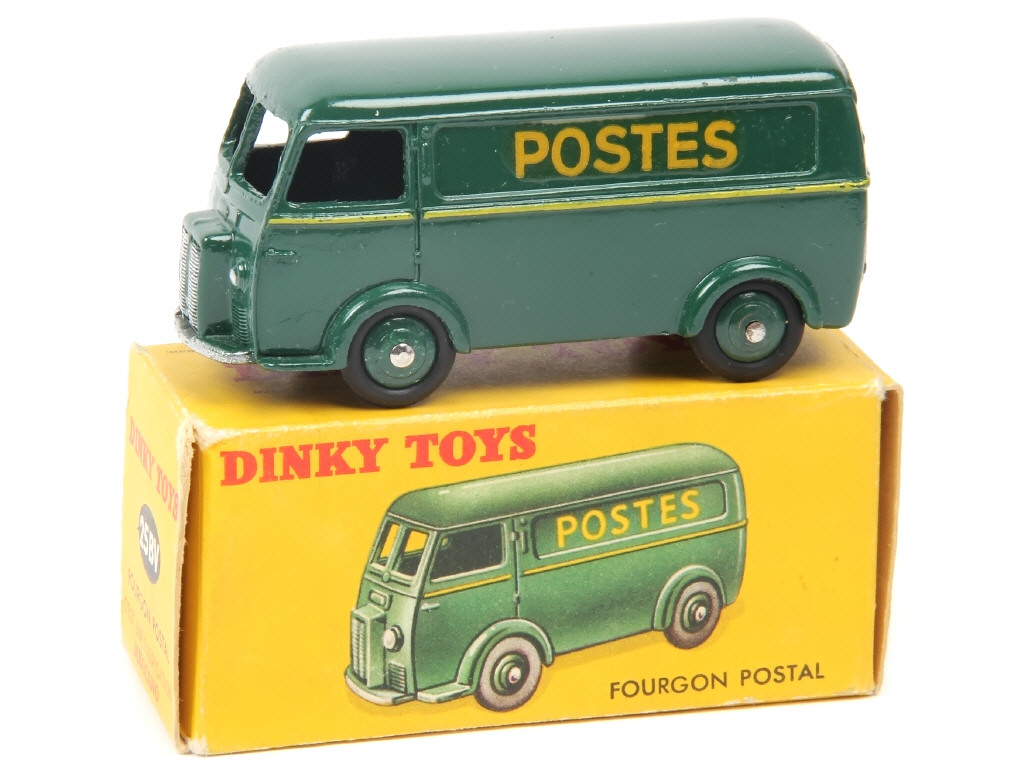 DINKY TOYS (FRANCE) 25BV PEUGEOT D3A 'POSTES' (version avec inscriptions en décalques & 1er type) vert foncé