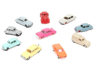 échelle 1/86ème - états de 'A' à 'B' - miniatures reproduisant notamment les modèles : RENAULT (manque attache), SIMCA & CITROËN - on y retrouve notamment les marques : JOUEF, NOREV, HERPA, WIKING & EKO