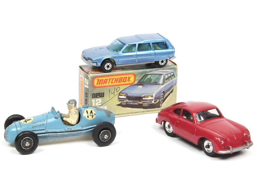 états de 'A' à 'E' - comprend : PORSCHE 356A, GORDINI 2,5L GRAND PRIX (2 pneus coupés & non conformes) & CITROEN CX (boite en état 'b') - on y retrouve les marques : CRESCENT TOYS, DINKY TOYS (GB) & MATCHBOX
